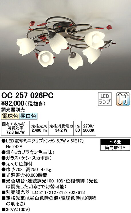 照明 おしゃれ シンプル モダン LEDオーデリック ODELIC シャンデリアOC257026PC 電球色〜昼光色フェミニン&シックなフローラルスタイル 調光調色・〜6畳