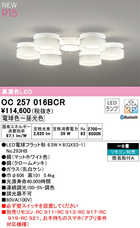 照明 おしゃれ ライトオーデリック ODELIC 調光調色シャンデリアOC257016BCR 電球色〜昼光色ガラス乳白ケシ 簡易取付A Bluetooth対応 〜8畳 肌を美しく魅せる高演色LED器具高約100mmの薄型フォルム
